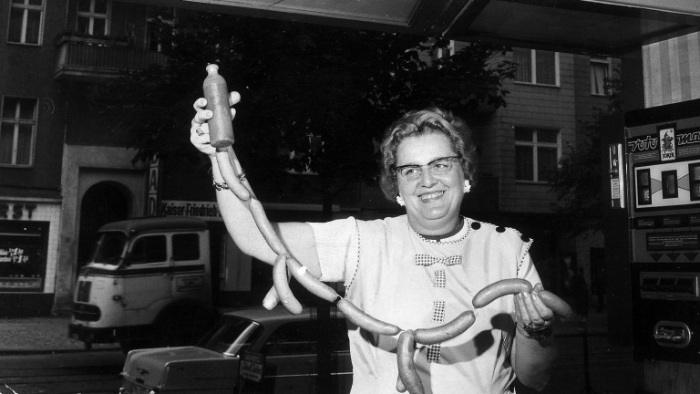 Einen Tag später begann sie ihre Kreation über gebratene, kleingeschnittene Brühwürste zu gießen. Auf die Idee kam sie durch ihren Mann, der damals für die Amerikaner arbeitete. Die pflegten auf ihre riesigen T-Bone Steaks, aber auch ihre kleinen Hot Dogs Unmengen von Ketchup zu gießen, was offensichtlich gut schmeckte. Da T-Bone Steaks für die Nachkriegsberliner schlichtweg zu teuer waren, machte sie aus der Not eine Tugend, badete ihre Würste in der selbstgemachten Soße, und fertig war das „Steak des kleinen Mannes“, das sie mit Holzspießchen anbot.