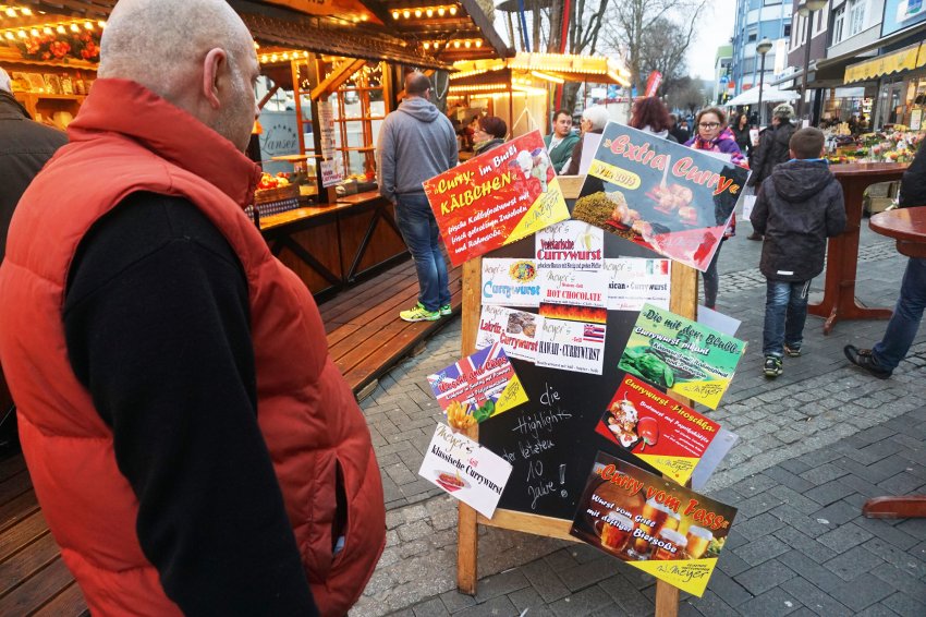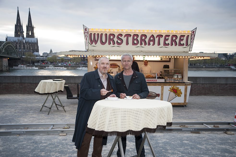 Und diese Version könnte erst recht die Verbreitung im benachbarten NRW erklären, von der keine eigene überliefert ist. Im Ruhrpott gilt sie inzwischen als heimisches Produkt, besungen von Herbert Grönemeyer nach einem Text von Diether Krebs, -zigfach verspeist in den „Tatort“-Folgen mit Götz „Schimanski“ George und geadelt mit Wortschöpfungen wie „Schimanski-Teller“, „Mantaplatte“ oder „Assischale“. Bestellt wird mit der Ansage: Curry mit Pommes Schranke. Was so viel heißt wie Currywurst mit Pommes frites, Ketchup und Mayonnaise. Inzwischen spießen sie auch die neuen Kölner Kommissare Ballauf (Klaus J. Behrendt) und Schenk (Dietmar Bär) regelmäßig an der Deutzer Rheinbrücke auf die Plastikgabel.