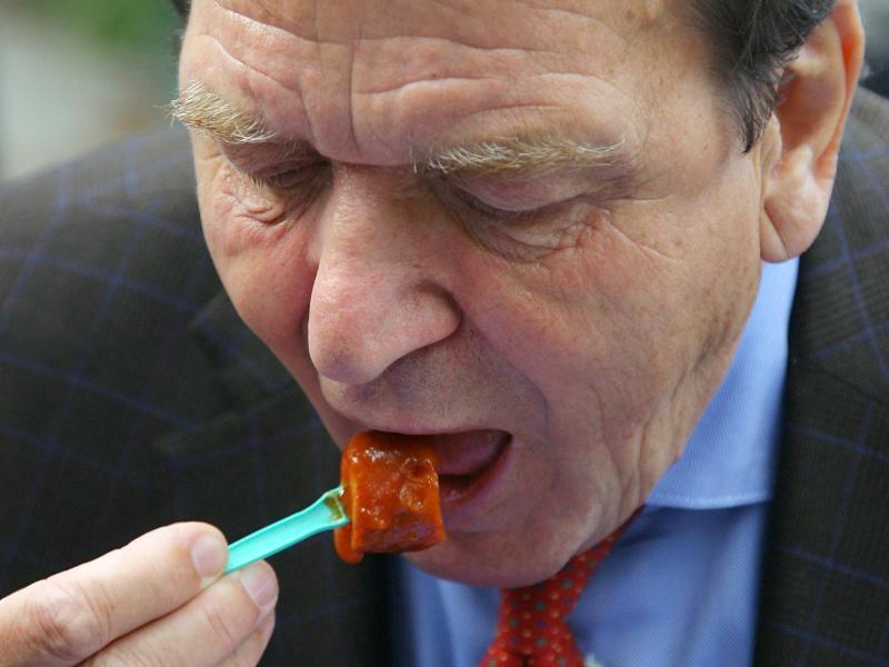 Die Landes-SPD war übrigens in den Landtagswahlkampf 2012 mit dem Slogan „Currywurst ist NRW“ gestartet – gerade im Ruhrpott ein Symbol für besondere Volksnähe. Der Slogan ging als Sieger aus einem Wettbewerb hervor, zu dem die Partei im Internet aufgerufen hatte. In der Parteizentrale gab es damals Currywurst für alle. Gratis, versteht sich. Resultat: Hannelore Kraft gewann, und zwar haushoch. Auf dem politischen Parkett outete sich auch Alt-Kanzler Gerhard Schröder (SPD) gern als Currywurst-Liebhaber: Beim Staatsbesuch des US-Präsidenten George W. Bush im Mai 2002 standen Eintopf aus Flusskrebsen, Apfelstrudel und Currywurst auf dem Speiseplan.