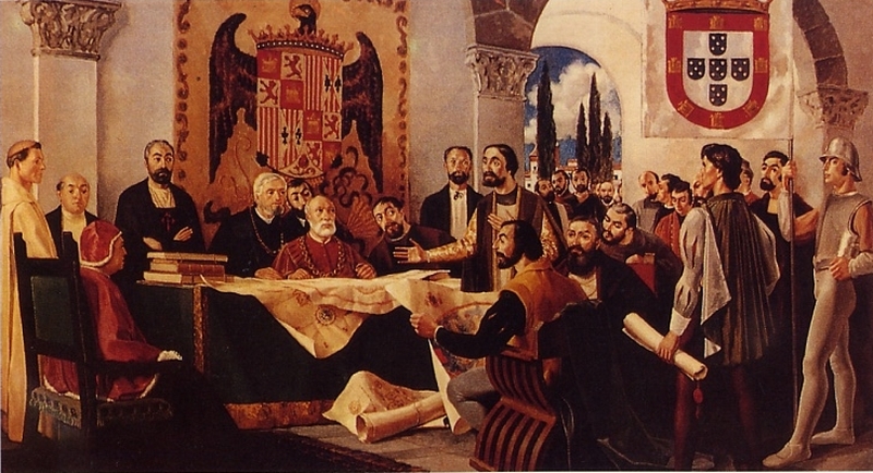 Allerdings hat einer der mächtigsten dieser Herrscher seit 1494 ein Problem. In diesem Jahr wurden, natürlich ohne die Einheimischen zu fragen, die Einflussgebiete der beiden konkurrierenden Mächte Portugal und Spanien durch einen Schiedsspruch von Papst Alexander VI. im Vertrag von Tordesillas festgelegt: Alle neu entdeckten Gebiete westlich der Demarkationslinie von 46 Grad westlicher Länge sollen Spanien gehören. Auf das Land östlich davon können die Portugiesen Anspruch geltend machen. Die Molukken lagen genau da.