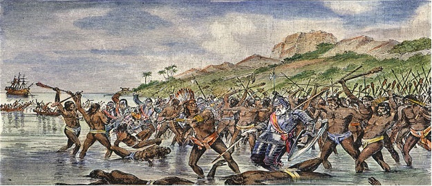 Auf der Insel Cebu mit König Radscha Humabon gelingt das zunächst, auf der Nachbarinsel Lappu-Lapu (Mactan) dagegen nicht. Als Magellan am 27. April 1521 versucht, die Insel gewaltsam in spanischen Besitz zu bringen, werden die zahlenmäßig unterlegenen Spanier von den Einheimischen noch am Ufer zurückgedrängt. Mehrere Seeleute sterben, darunter auch Magellan. Pigafetta berichtet, dass der Generalkapitän als einer der letzten, noch im Wasser stehend, gekämpft habe, um den Rückzug seiner Leute zu decken. Ein vergifteter Pfeil habe erst seinen Oberschenkel durchbohrt, danach sei er von zwei Lanzenstößen niedergestreckt worden. Magellans Sklave Melaka kann fliehen.