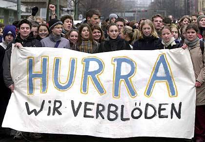 Das Plakat „Hurra – wir verblöden“ bringt es auf den Punkt. Das Fernsehen leistet vor allem in Gestalt der Privaten vollumfänglich seinen Beitrag. PC Ballerspiele will man verbieten, aber RTL darf auf Sendung bleiben? Ne oder…