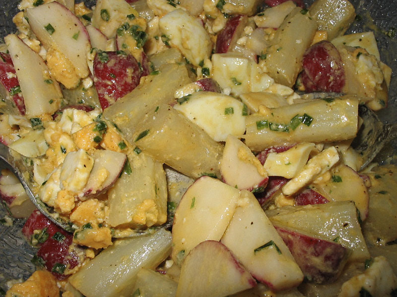 Jetzt das Dressing entscheiden: im „French“-Fall entfallen Honig bzw. Sirup/im Mayo-Fall der Zitronensaft; aber beide Varianten haben etwas Eigenes. Nach dem Dressieren wieder mischen, mit dem Schnittlauch bestreuen und kalt stellen, am besten 24 Stunden. Aufgrund der Konsistenz vieler Zutaten wässert der Salat nach: entweder ignorieren oder abschöpfen.