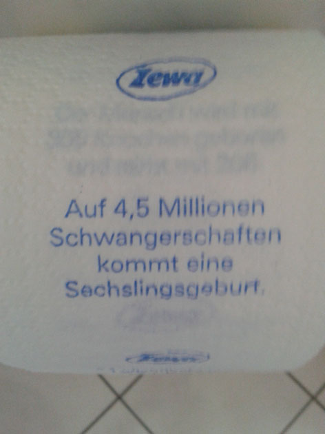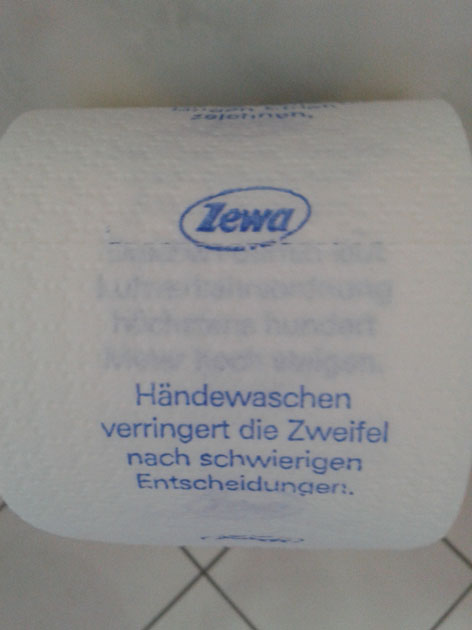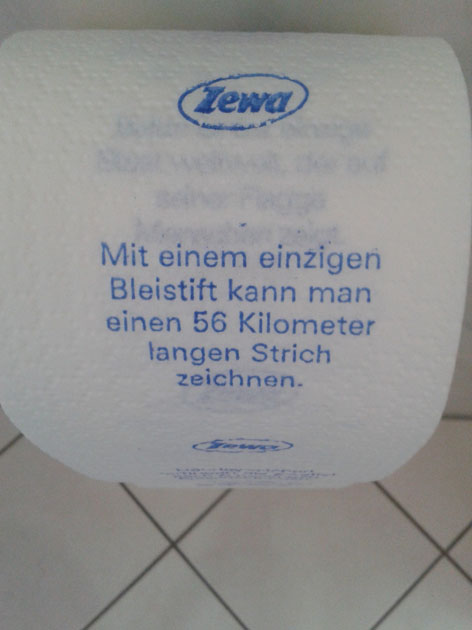 PS: Auch Hersteller diverser Produkte scheinen der Institution „Schule“ die Kompetenz zur Wissensvermittlung abzusprechen. Anders kann ich mir nicht erklären, dass in einer hessischen Pension dem Toilettenpapier diese Aufgabe übertragen wird 🙂 ; Screenshots dieser Art „Lernen in der Freizeit“ haben das Posting hoffentlich angenehm aufgelockert…