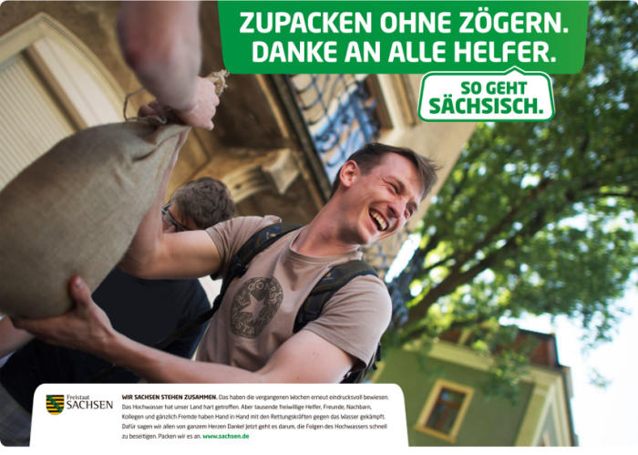 Und spätestens an dieser Stelle drängen sich Überlegungen auf, wie denn nun „Sächsisch“ aufzufassen ist. Lexikalisch als Adjektiv – aber semantisch also als Eigenschaftswort? Sächsisch zu komparieren kommt sicher niemandem in den Sinn – ist Leipzig sächsischer als Dresden, und Chemnitz am sächsischsten? Was also bezeichnet eine Eigenschaft „sächsisch“? Die ersten Flutkampagnen-Plakate gaben die lapidare Auskunft „Zupacken ohne zögern“. Bayern, Bremer und Berliner machen das nicht?