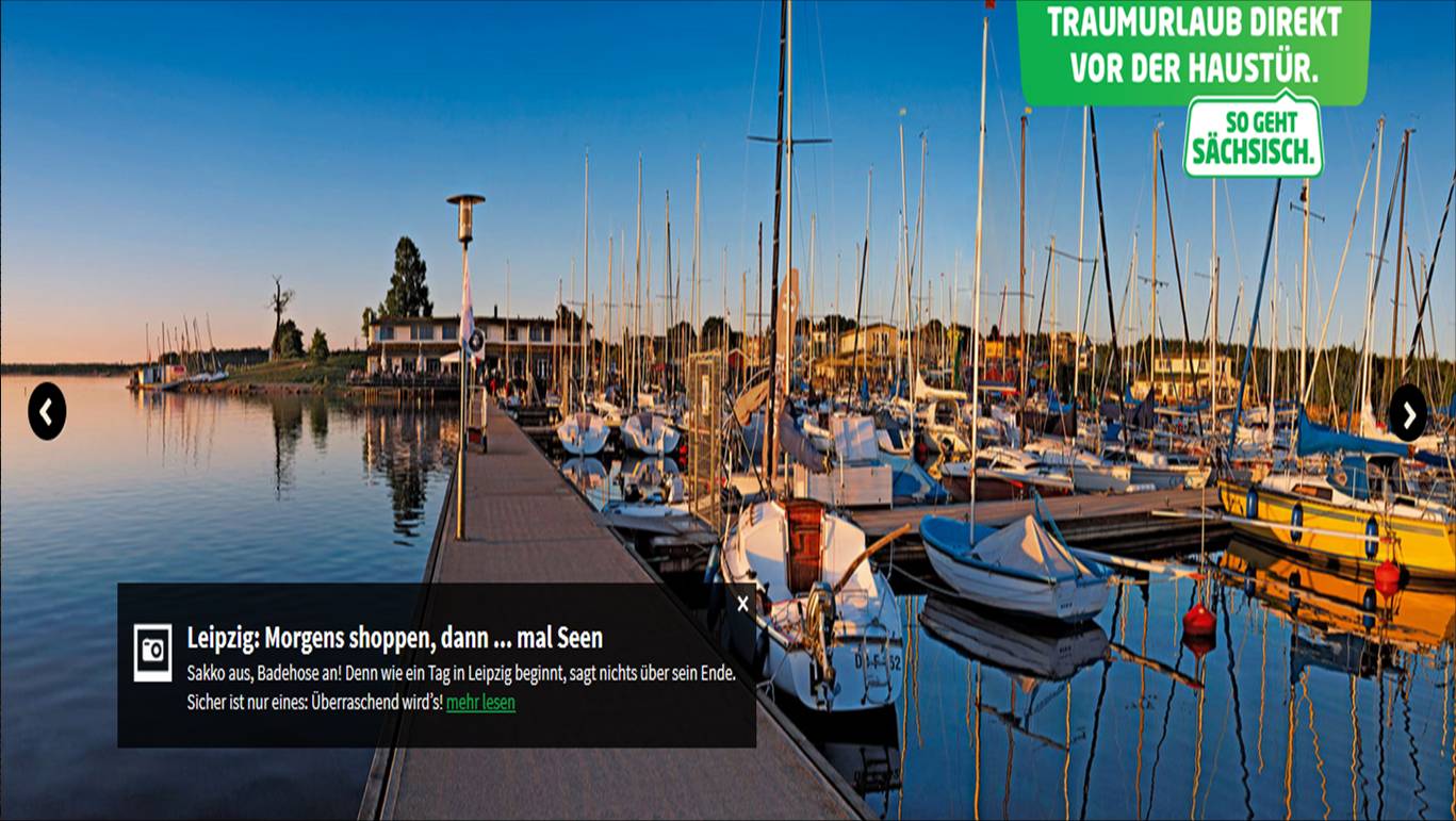 Zu diesen semantisch-lexikalischen Aspekten gesellen sich mindestens drei weitere. Zum ersten die publizistisch (vgl. den taz-Link) mitkommunizierten Negativabgrenzungen der Kampagne wie „Elbphilharmonie ohne Verstimmung“ (das auf Hamburg anspielte – immerhin Dresdens Partnerstadt!), aber auch „Madonna ohne Skandale“ oder „Baden ohne Württemberg“: der Slogan liefert keinen positiven Gegenentwurf. Diese „Disserei auf niedrigstem Niveau“ hart an der Grenze zur Arroganz ist zum Glück vom Tisch. Übrig geblieben ist online beim Motiv des Cospudener Sees das Wortspiel „Morgens shoppen, dann … mal Seen“. Nun ja.