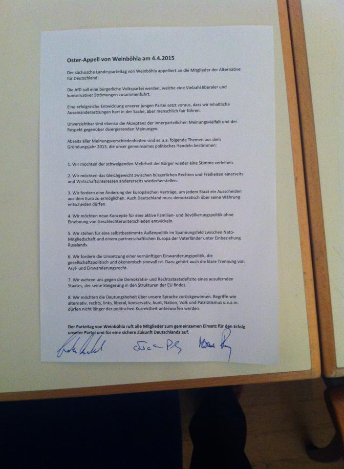 Erstens: das Verhältnis unserer Partei, die primär eurokritisch gestartet war, zu jenen Themen, die darüber hinausweisen. Dass Funktionäre, aber auch Mitglieder zu diesen Themen, obwohl es noch keine programmatischen Aussagen auf Bundesebene gibt, individuelle Ansichten wiedergeben, die vor allem von ihren persönlichen Vorstellungen geprägt sind, entspricht gelebter Meinungsfreiheit. Der Appell nun erweitert das Eurothema um jene Primärthemen, die unter den mehr als 20 000 Mitgliedern unumstritten sein dürften (Familien-, Außen-, Einwanderungspolitik…). Jedoch spart er damit zugleich die umstrittenen Sekundär- und Tertiärthemen aus, die zur Bildung diverser Flügel überhaupt erst beitrugen und /oder von vielen Mitgliedern als nicht mehr AfD-relevant wahrgenommen wurden: neben den drei „I“ Identität, Islam, Inklusion auch Bildung, Sicherheit, GEZ…