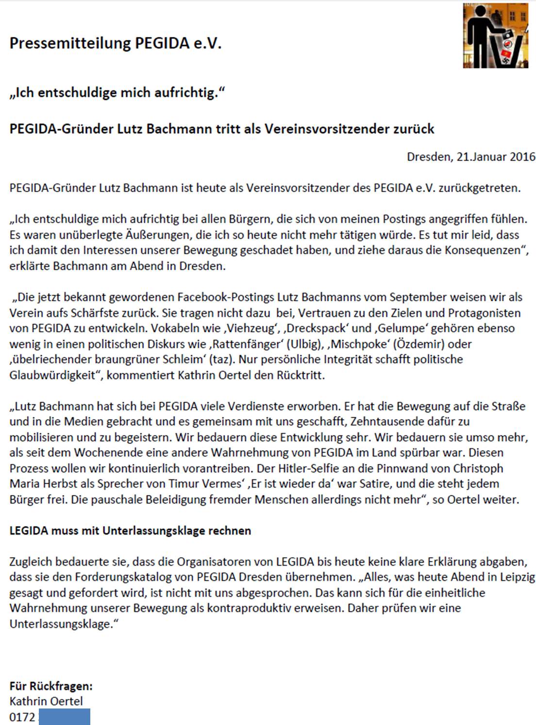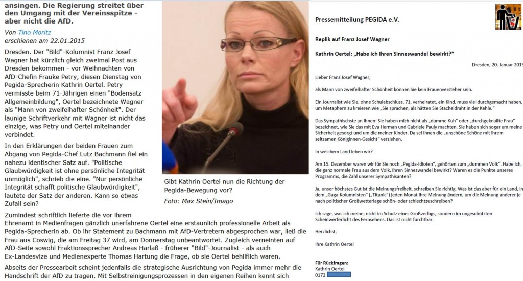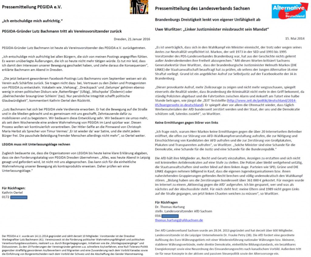 1) Vom 20. Dezember 2014 bis zur Spaltung am 28. Januar 2015 habe ich für PEGIDA die schriftliche Pressearbeit geleistet. Genauer und besser: für (und mit) Katrin Oertel, die als Pressesprecherin des PEGIDA e.V. fungierte, sowie Achim Exner, damals ebenso wie ich Kreisvorstand der AfD Dresden. Dass ich die Pressemitteilungen in diesem Zeitraum verfasst habe, versichere ich gern an Eides Statt – schizophren, dafür jetzt angegriffen zu werden. Als Beispiel eine PM: