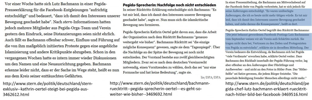 1b) Pressesprecher werden gewählt, um im Auftrag der sie gewählt Habenden (!) mit der Presse zu sprechen. Anbei drei STERN-Ausrisse, die nicht nur Zitate meiner obigen PM wiedergeben, sondern auch zeigen, dass Bachmann meine PM selbst auf Facebook geteilt hat.