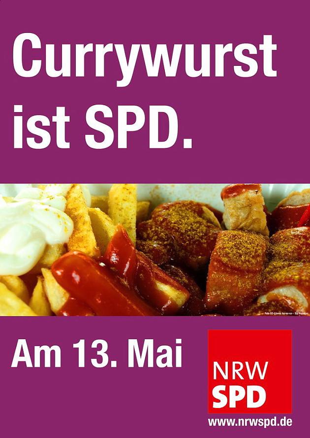 In Nordrhein-Westfalen übrigens war die Landes-SPD in den Landtagswahlkampf 2012 mit dem Slogan „Currywurst ist NRW“ gestartet – gerade im Ruhrpott ein Symbol für besondere Volksnähe. Der Slogan ging als Sieger aus einem Wettbewerb hervor, zu dem die Partei im Internet aufgerufen hatte. In der Parteizentrale gab es damals Currywurst für alle. Gratis, versteht sich. Resultat: Hannelore Kraft gewann, und zwar haushoch.