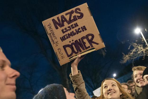 „Kartoffeln statt Döner“ stand auf einem Transparent, das ein Kögida-Demonstrant hochhielt. Prompt ließ sich nicht nur der Oldenburger Imbissbesitzer Hani Alhay, ein gebürtiger Libanese, zu einem „Kartoffeldöner“ inspirieren, den er sich beim Münchner Patentamt schützen ließ, sondern war auch „Nazis essen heimlich Döner“ in schwarzen Großbuchstaben auf einem Pappschild zu lesen, das zwei Aachener Studentinnen zur „Köln stellt sich quer“-Demo mitbrachten. Der Slogan wurde rasch zum Dauerbrenner, der unter anderem Basecaps und T-Shirts zierte, weil ihm ein bestimmter Symbolwert zugeschrieben werden konnte, der sich linksgrün bestens semantisieren ließ, sicher auch (mit) hervorgerufen durch die anfängliche Titulierung der NSU-Mordserie als „Döner-Morde“.