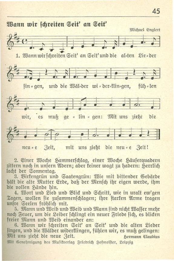 Nein, es geht nicht um „Wann wir schreiten Seit’ an Seit’“ von Hermann Claudius von 1914, das bis heute Schlusslied von SPD-Parteitagen ist und sich nicht auf der Platte, wohl aber auf S. 45 des Liederbuchs findet. Es geht um ein Lied aus der Zeit der Befreiungskriege gegen Napoleon Anfang des 19. Jahrhunderts: das von Max von Schenkendorf 1814 (!) verfasste Stück „Wenn alle untreu werden“, das später von der SS als „Treuelied“ instrumentalisiert wurde und auf S. 13 abgedruckt ist.