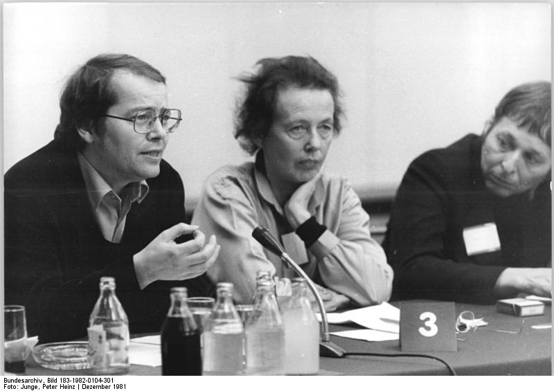 Volker Braun, Ruth Berghaus, Wieland Förster bei der Berliner Begegnung zur Friedensförderung. Quelle: https://de.wikipedia.org/wiki/Volker_Braun#/media/File:Bundesarchiv_Bild_183-1982-0104-301,_Volker_Braun,_Ruth_Berghaus,_Wieland_F%C3%B6rster.jpg