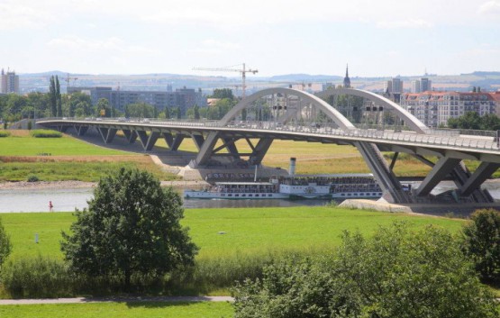 Ein Berliner Büro setzte sich unter den 27 eingereichten Entwürfen durch und gewann den 1. Preis samt 75.000 Mark. Sein Entwurf sah eine Stahlkonstruktion von 635 Metern Länge mit einem Bogen in der Spannweite von 145 Metern und einem sich anschließenden Landtunnel von 400 Metern Länge vor. Veranschlagt mit 156 Millionen Euro – 96 Millionen steuert der Freistaat Sachsen zu der Bausumme zu, 46 Millionen muss die Stadt Dresden aufbringen – sollten es schließlich 180 Millionen werden. Im jahrelangen Ringen um Korrekturen sind zuerst zusätzliche Lärmschutzmaßnahmen, dann eine Geschwindigkeitsbeschränkung sowie schließlich eine „Verschlankung“ der Konstruktion verordnet worden. An der optischen Wirkung des Bauwerks änderte sich nichts.