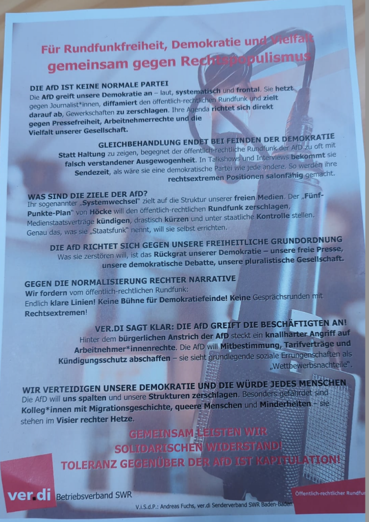 Der öffentlich-rechtliche Rundfunk ÖRR in Deutschland hat seine Neutralitätspflicht preisgegeben und sich einem ideologischen Milieu verschrieben – wie in Flugblatt in der Kantine des SWR-Funkhauses Baden-Baden zeigt.
