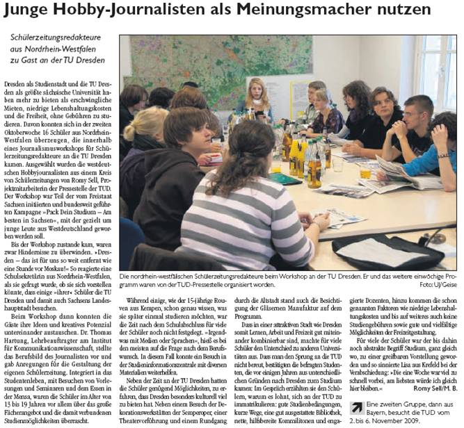 - Workshops „Journalismus: Einführung“ für Schülerzeitungsredakteure aus NRW und Bayern